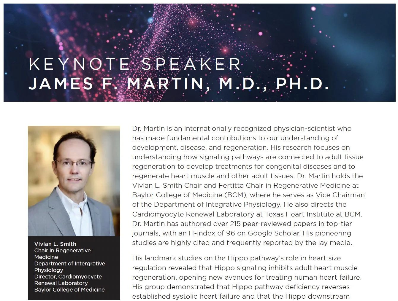 Yesterday, the Cardiovascular Research Institute (CVRI) at Baylor College of Medicine hosted its 13th Annual Research Symposium at Cullen Auditorium, bringing together leading investigators from across the Texas Medical Center and beyond for a full day of science and discovery. Among the highlights of this year's program is a keynote address by Dr. Martin, the Vivian L. Smith Chair in Regenerative Medicine at Baylor College of Medicine and the distinguished keynote speaker for the Texas Medical Center. Dr. Martin is Vice Chairman of the Department of Integrative Physiology at BCM and Director of the Cardiomyocyte Renewal Laboratory at the Texas Heart Institute at Baylor College of Medicine.